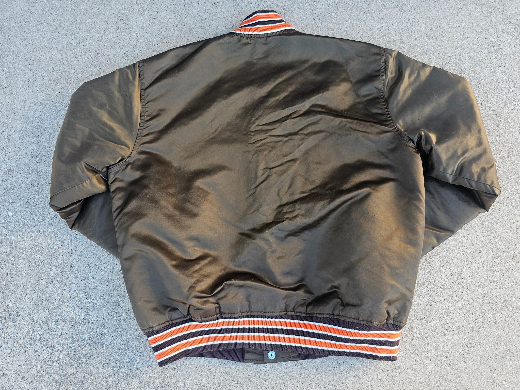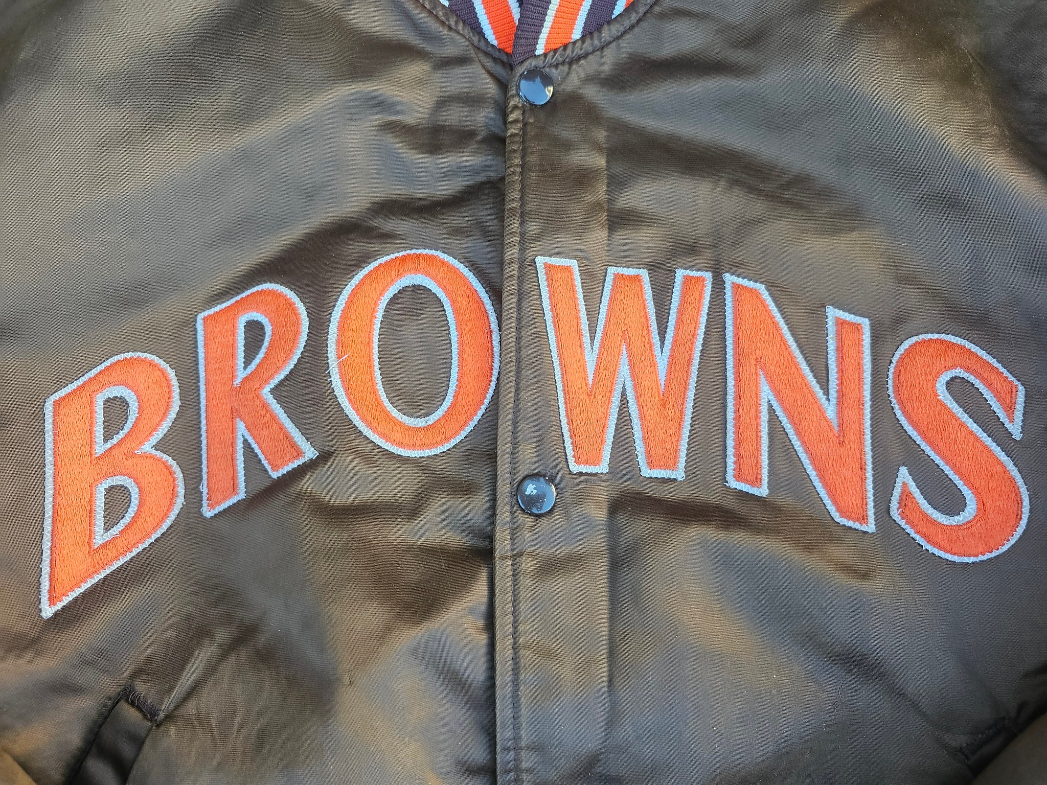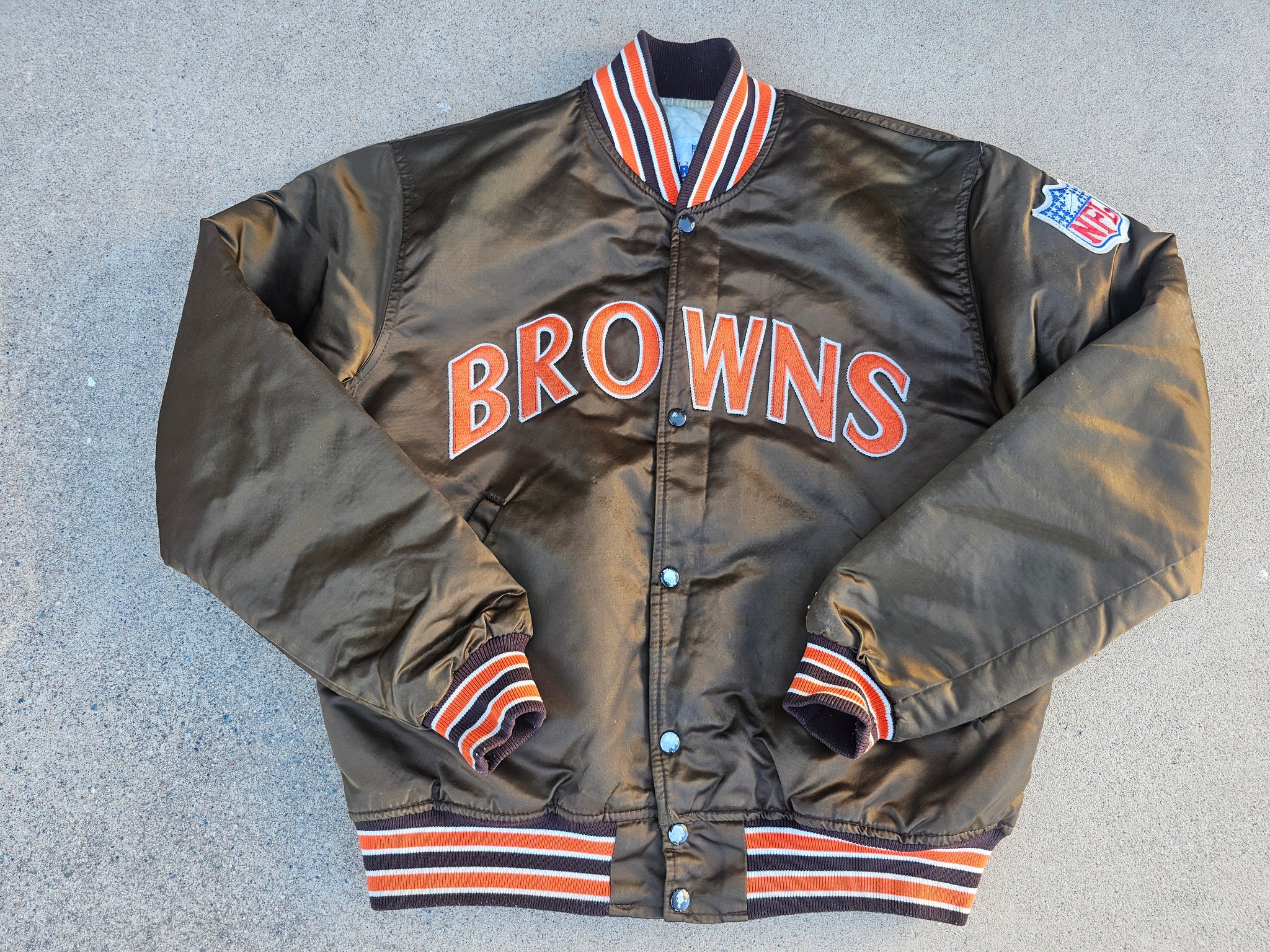 Vintage Mens Starter Cleveland Browns Satin Button Up Jacket Size Large-Brown. Good Condition. Light Distressing in Wrist by Starter Logo. Chipping of Buttons. Light Bubbling.(Pictured)