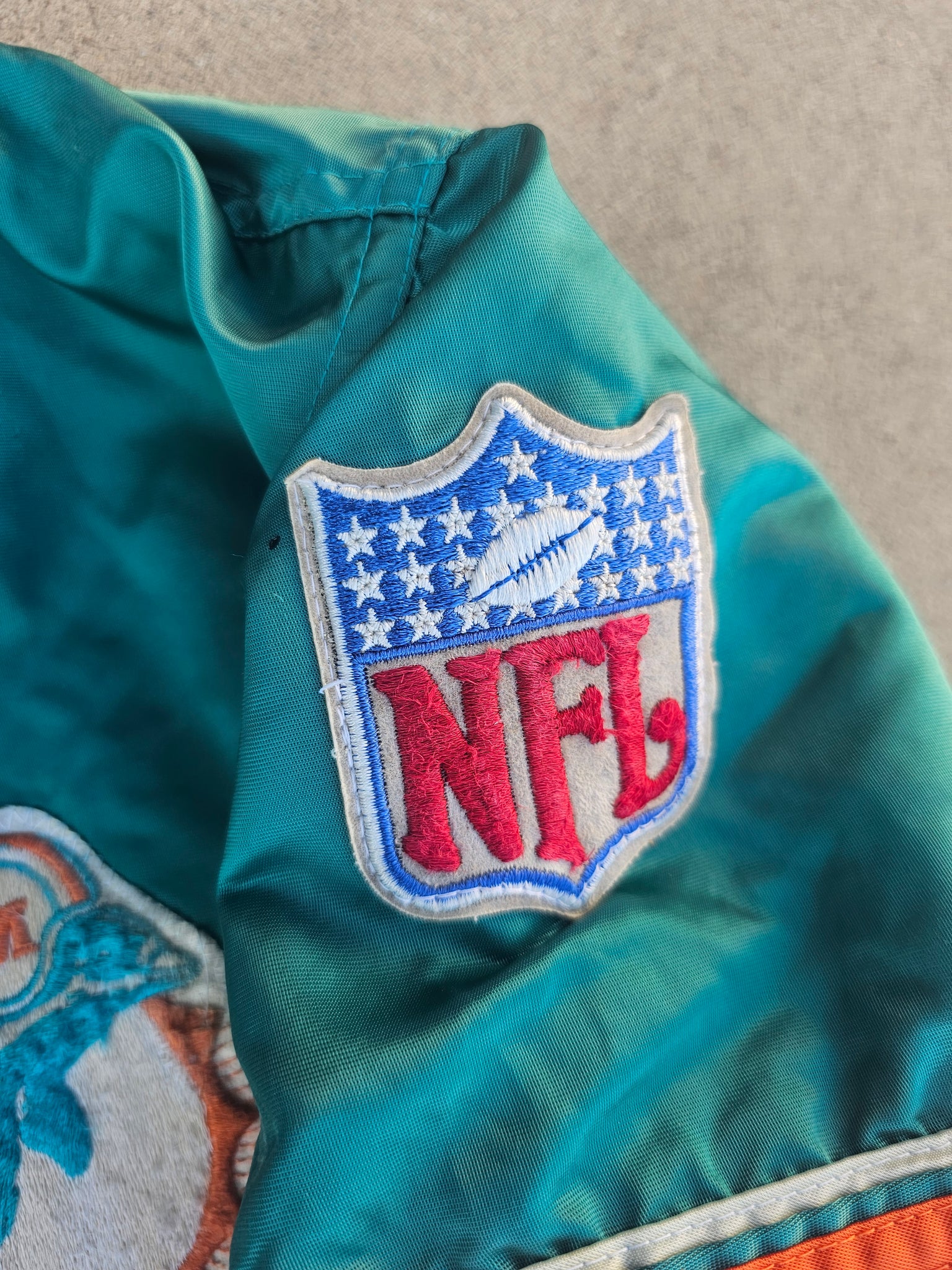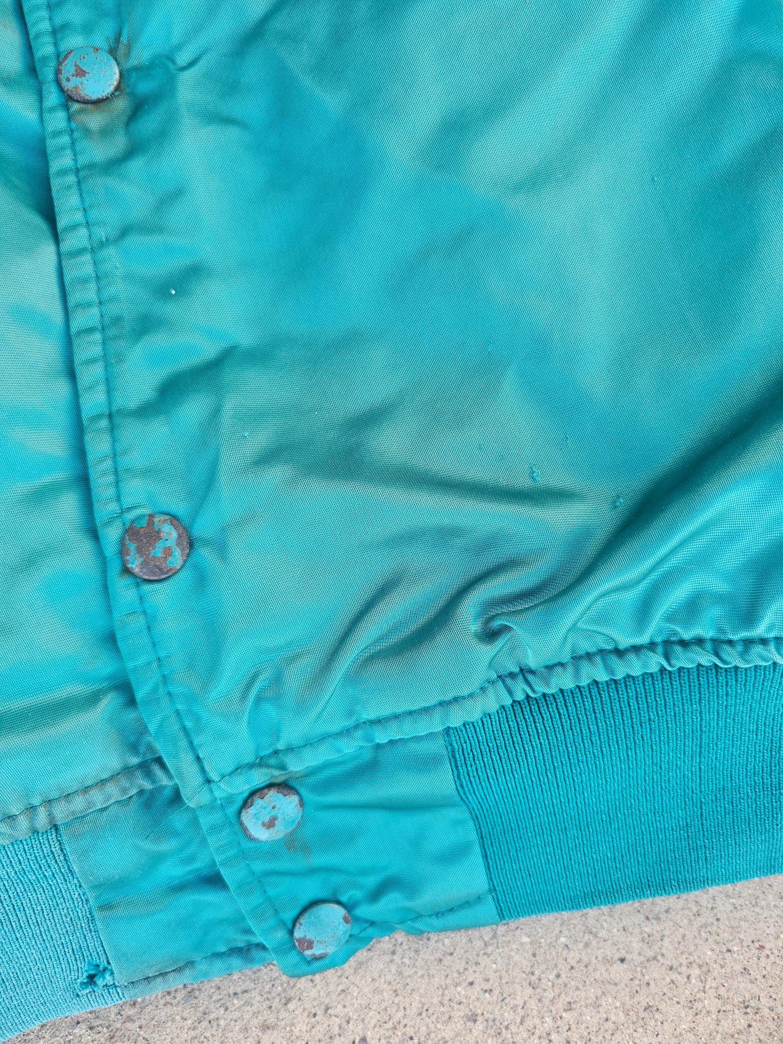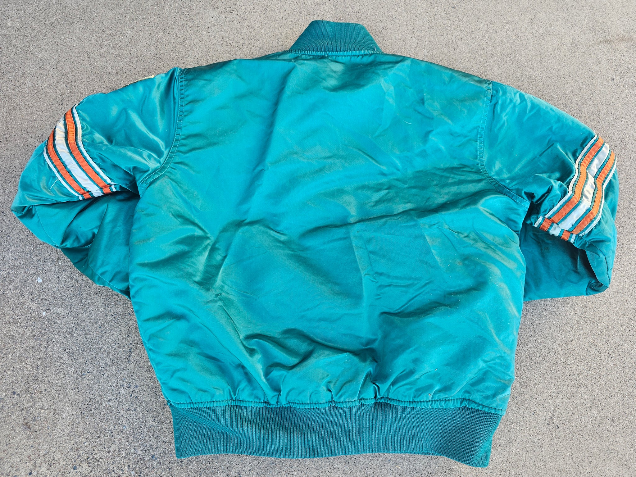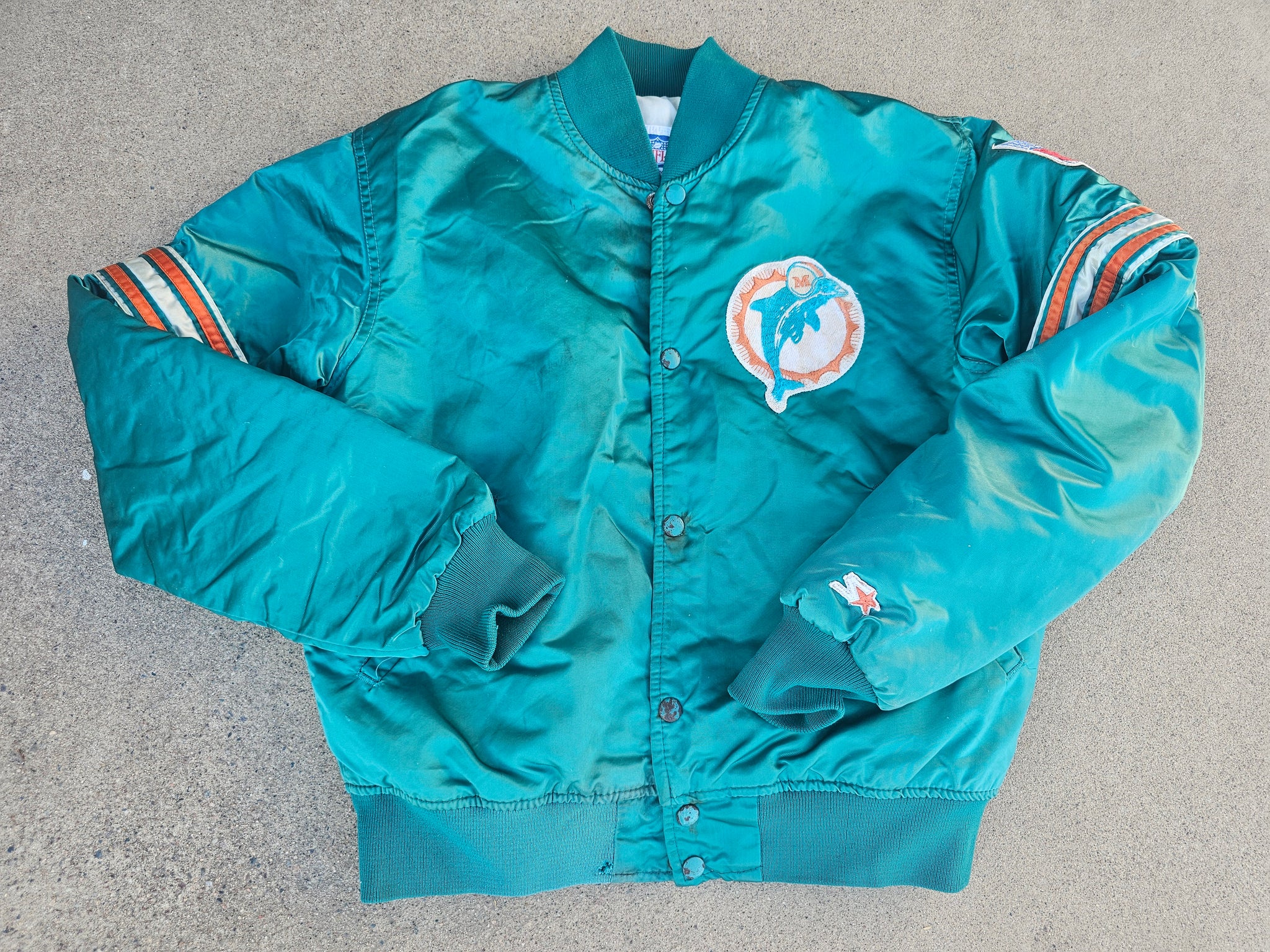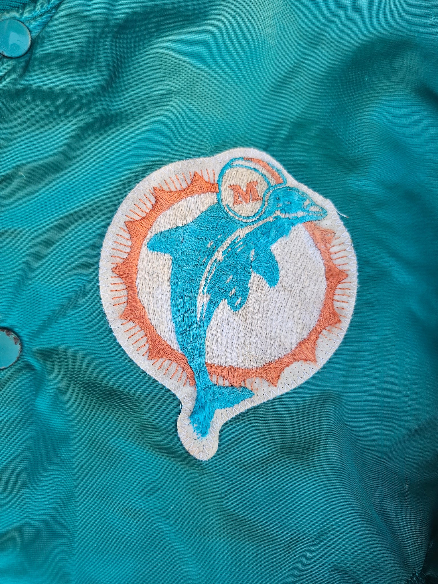 Vintage Mens Starter Miami Dolphins Satin Button Up Jacket Size Medium-Aqua. Fair Condition. Stains Throughout. Rusted Buttons. Small Pulls on Back.(Pictured)